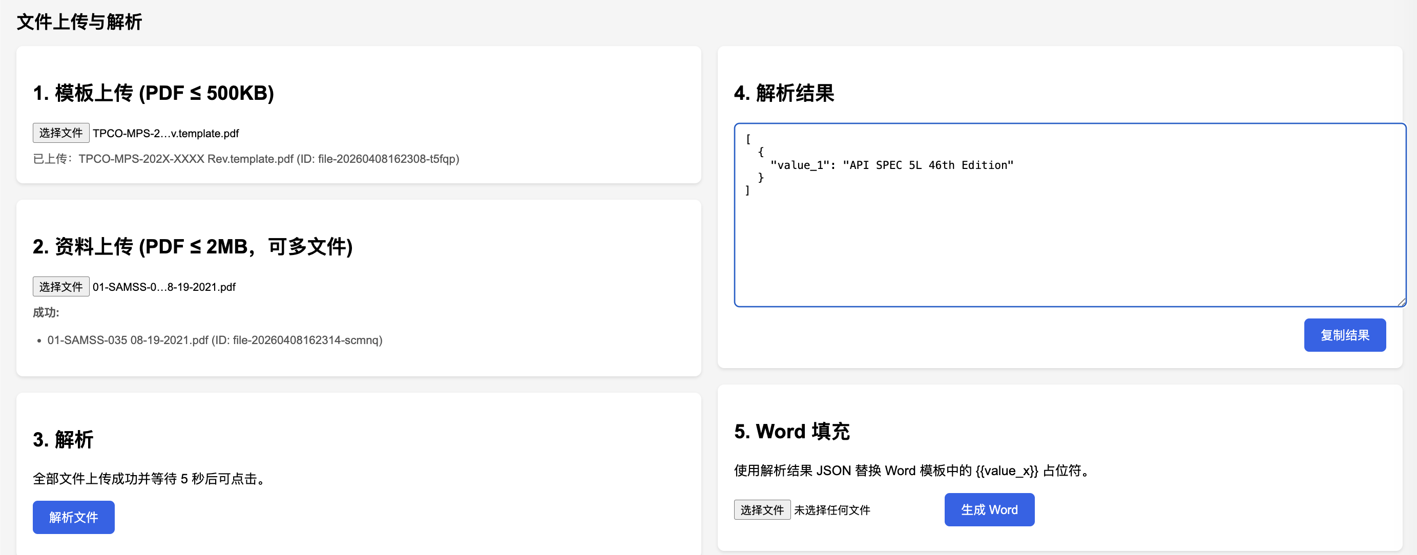 - 解析按钮与结果展示:解析请求将模板 file_id 置于首位、附上资料 file_id 队列提交到火山 Doubao API;后端原样转发,前端展示返回中的 JSON 文本并支持一键复制。